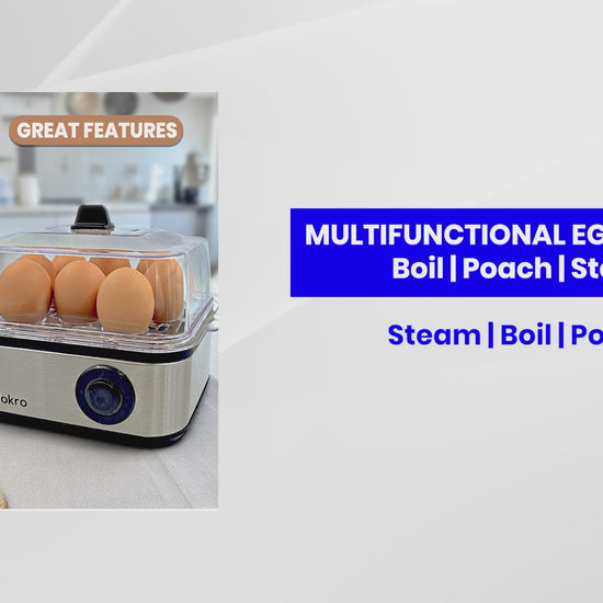 - ▶ QUICK & EFFICIENT EGG BOILING WITH DOKRO – The Dokro Electric Egg Boiler is your go-to kitchen appliance for boiling up to 8eggs in minutes. Designed for convenience and speed, it's perfect for busy mornings, meal prep, or family breakfasts. Its sleek, compact design with a transparent lid adds a modern touch to any kitchen.