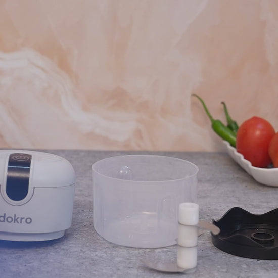 Transform your kitchen prep routine with the dokro Rechargeable Mini Electric Chopper. This compact yet powerful 250ml food processor makes quick work of mincing garlic, ginger, onions, vegetables, meat, and nuts. The convenient one-touch operation ensures effortless control, while the food-grade bowl and stainless steel blades deliver reliable performance. Its rechargeable design eliminates the need for constant battery replacements, making it both practical and convenient for daily use. The sleek black and white design complements any modern kitchen aesthetic, while its compact size ensures minimal counter space usage. Perfect for both small batch food preparation and everyday cooking needs, this mini chopper streamlines your cooking process and helps you achieve consistently minced ingredients with minimal effort. The transparent bowl allows you to monitor the chopping progress, ensuring your ingredients are processed to your desired consistency.
